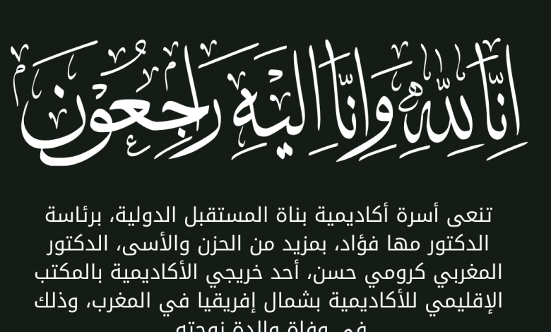 تتقدم أكاديمية بناة المستقبل الدولية بكامل التعازي والمواساة للدكتور كرومي حسن وعائلته الكريمة، داعيين الله العلي القدير أن يتغمد الفقيدة بواسع رحمته ويسكنها فسيح جناته، وأن يرزق أهلها وذويها الصبر والسلوان في هذه المناسبة الأليمة.