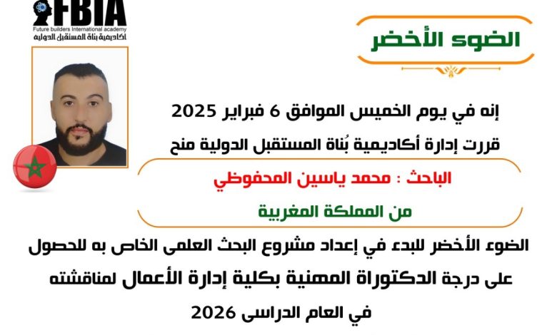 محمد ياسين المحفوظي يحصل على “الضوء الأخضر” للبحث في أكاديمية بناة المستقبل الدولية لنيل الدكتوراه المهنية