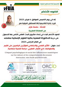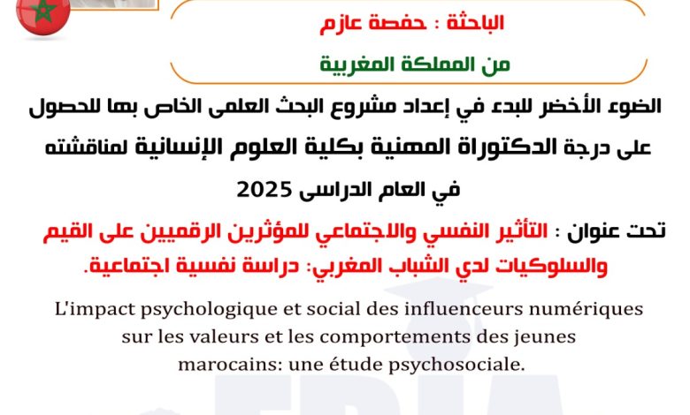 اختارت الباحثة حافصة عازم موضوعًا ذا طابع علمي معاصر وهو ” التأثير النفسي والاجتماعي للمؤثرين الرقميين على القيم والسلوكيات لدى الشباب المغربي: دراسة نفسية اجتماعية “، للحصول على درجة الدكتوراه المهني ، بكلية العلوم الانسانية لمناقشتها عام 2025.