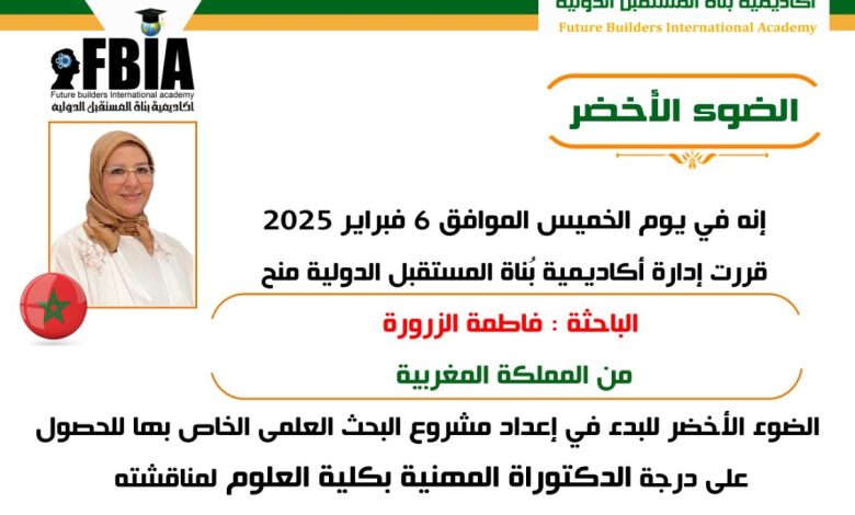 فاطمة الزرورة تحصل على “الضوء الأخضر” للبحث في أكاديمية بناة المستقبل الدولية لنيل الدكتوراه المهنية