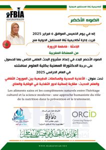 اختارت الباحثة فاطمة الزرورة موضوعًا ذا طابع علمي معاصر وهو ” الأغذية الصحية والمكملات الطبيعية بين الموروث الثقافي والعلم الحديث: مقارنة إنسانية لدور التغذية في الوقاية والعلاج “، للحصول على درجة الدكتوراه المهني ، بكلية العلوم الانسانية لمناقشتها عام 2025.