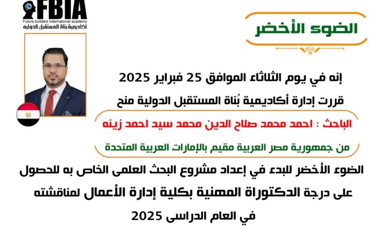 أحمد محمد صلاح الدين يحصل على “الضوء الأخضر” للبحث في أكاديمية بناة المستقبل الدولية لنيل الدكتوراه المهنية