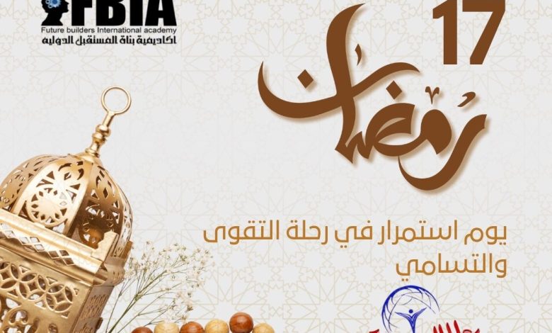 تستمر الايام المباركة لتجديد العهد مع الله في السابع عشر من رمضان 17، تستمر رحلة التقوى والتسامي، ما زالت الفرصة أمامنا لنجدد العهد مع الله، ونطهر قلوبنا من كل شائبة، لعل هذا اليوم يحمل لكم الفرج والسعادة، ويقربكم من رحمة الله التي وسعت كل شيء.