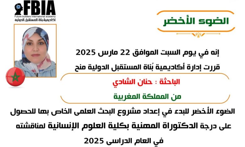 تعلن أكاديمية بناة المستقبل الدولية، تحت قيادة الدكتورة مها فؤاد، مطورة الفكر الإنساني ورئيس الأكاديمية، حصول الباحثة حنان الشادي من المملكة المغربية على “الضوء الأخضر”، للبحث العلمي استمراراً لمبادراتها في تقديم الدبلومات في إدارة الأعمال والتنمية البشرية والعلوم الإنسانية الإرشادية، فضلاً عن درجات الماجستير والدكتوراه والاستاذية المهنية للعام الدراسي الجديد 2025.