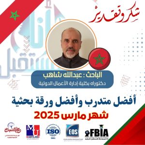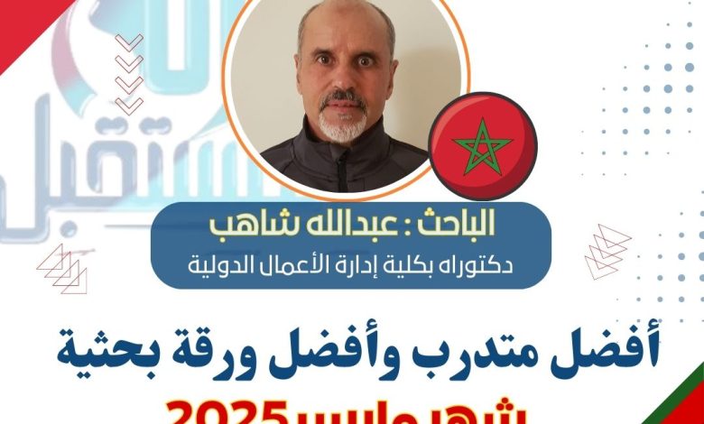 أعلنت أكاديمية بناة المستقبل الدولية، الوكيل الحصري لجامعة ميرلاند في مصر والمغرب والإمارات العربية المتحدة، عن تكريم الباحث المغربي عبدالله شاهب – دكتوراه بكلية إدارة الأعمال الدولية، أفضل المتدربين وأفضل ورقة بحثية لشهر مارس 2025، يأتي هذا التكريم تحت إشراف الدكتورة مها فؤاد، رئيس مجلس إدارة الأكاديمية وراعية الابتكار والإبداع وريادة الأعمال في الوطن العربي، في إطار تكريم الجهود الأكاديمية المتميزة.