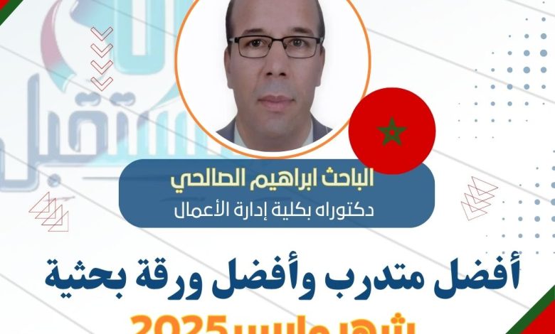 أعلنت أكاديمية بناة المستقبل الدولية، الوكيل الحصري لجامعة ميرلاند في مصر والمغرب والإمارات العربية المتحدة، عن تكريم الباحث المغربي إبراهيم الصالحي، دكتوراه بكلية إدارة الأعمال، أفضل المتدربين وأفضل ورقة بحثية لشهر مارس 2025، يأتي هذا التكريم تحت إشراف الدكتورة مها فؤاد، رئيس مجلس إدارة الأكاديمية وراعية الابتكار والإبداع وريادة الأعمال في الوطن العربي، في إطار تكريم الجهود الأكاديمية المتميزة.
