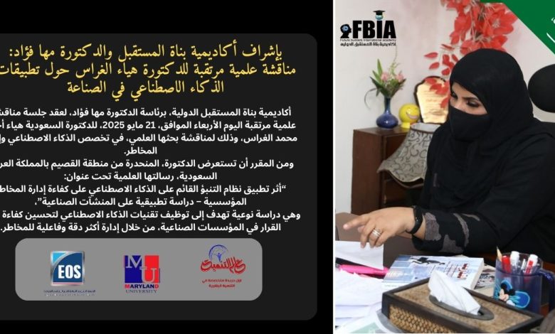 بإشراف أكاديمية بناة المستقبل والدكتورة مها فؤاد: مناقشة علمية مرتقبة للدكتورة هياء الغراس حول تطبيقات الذكاء الاصطناعي في الصناعة