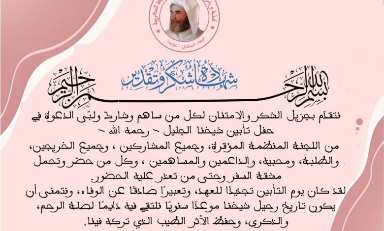 وأعربت الأسرة عن تقديرها العميق لهذا التضامن الذي عبّر عن صدق الوفاء وقوة الروابط الإنسانية، مؤكدة أن هذه المساندة كان لها أثر بالغ في التخفيف من المصاب الجلل الذي ألمّ بها، وأن حضور الأحبة وأهل العلم والطلبة ورفاق الفقيد جسّد أسمى معاني الإخلاص والمحبة.
