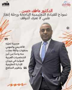 وقد عبّرت الدكتورة مها فؤاد، رئيس مجلس إدارة أكاديمية بناة المستقبل الدولية، عن فخرها بهذا النموذج الأكاديمي المتميز، مشيدةً بما قدّمه الدكتور عاطف من إضافة نوعية في مجالات الإدارة التربوية وريادة الأعمال التعليمية، مؤكدةً أنه “أحد الكفاءات العربية التي تحمل رؤية تنموية حقيقية قادرة على قيادة التغيير الإيجابي في مستقبل التعليم العربي”.