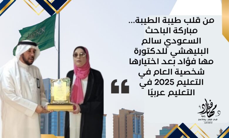 من قلب طيبة الطيبة… مباركة الباحث السعودي سالم البليهشي للدكتورة مها فؤاد بعد اختيارها شخصية العام في التعليم 2025 في التعليم عربيًا