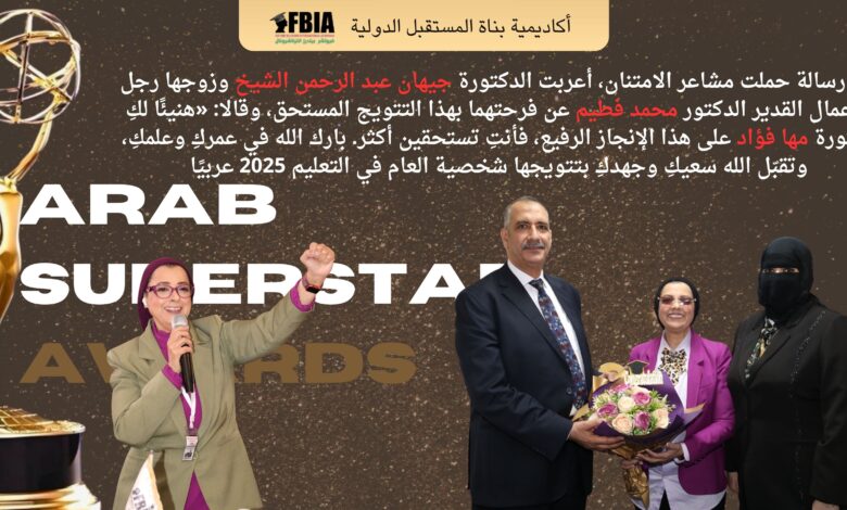 قدمت الدكتورة جيهان عبد الرحمن عبد الرحمن الشيخ، دكتوراه في إدارة الأعمال، تهنئة رسمية إلى الدكتورة مها فؤاد، رئيسة أكاديمية بناة المستقبل الدولية، بعد اختيارها شخصية العام في التعليم 2025 على مستوى مصر والوطن العربي، ضمن فعاليات حفل سوبر ستار العرب المقرر انعقاده بدار الأوبرا المصرية يوم السادس من ديسمبر.