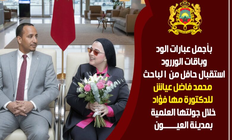 استقبل الباحث المغربي محمد فاضل عياش الدكتورة مها فؤاد، رئيس مجلس إدارة أكاديمية بناة المستقبل الدولية والوكيل الحصري لجامعة ميريلاند في مصر والمغرب والإمارات العربية المتحدة، استقبالًا حافلًا ومميزًا فور وصولها إلى مدينة العيون – الساقية الحمراء، ضمن جولتها العلمية بالمغرب، في مشهد يعكس التقدير والاحترام لمكانتها العلمية وريادتها الأكاديمية.