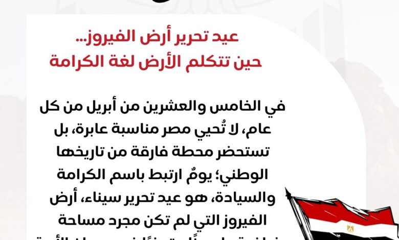 في الخامس والعشرين من أبريل من كل عام، لا تحيي مصر مناسبة عابرة، بل تستحضر محطة فارقة من تاريخها الوطني؛ يوم ارتبط باسم الكرامة والسيادة، هو عيد تحرير سيناء، أرض الفيروز التي لم تكن مجرد مساحة جغرافية، بل رمزًا متجذرًا في وجدان الأمة المصرية.