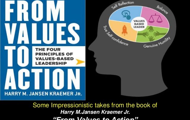 إن الطريق إلى القيادة القيمية ينحصر ما بين نقطتين كلتاهما قائمة على المبادئ الأربعة الرئيسية للقيادة القيمية. تلك المبادئ هي التأمل الذاتي، والتوازن، والثقة بالنفس، وأخيرًا التواضع. تتداخل وتتشابك هذه المبادئ بحيث يُفيد ويُضيف كل منها إلى الآخر وتشكل معًا أساسًا قويًا وأرضًا صلبة للقيادة القيمية.